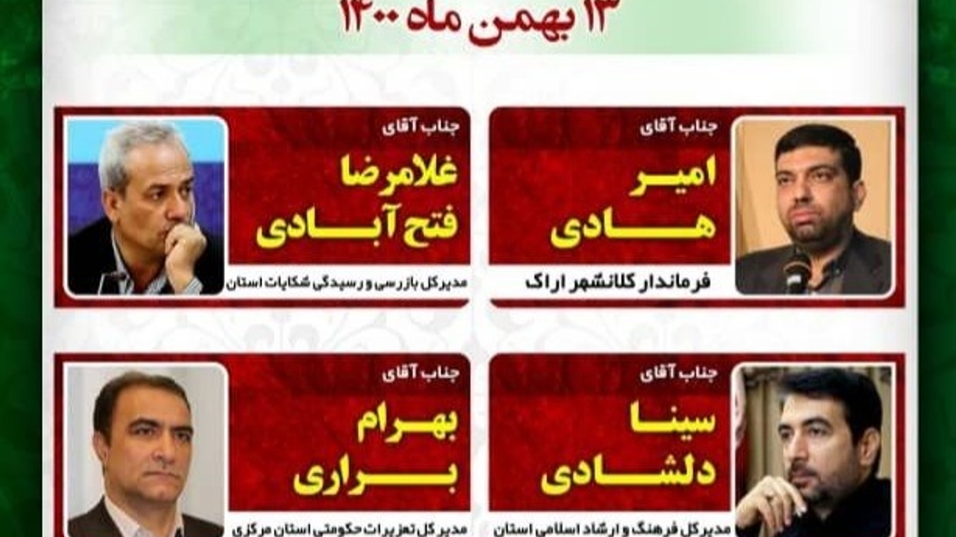 نشست پرسش و پاسخ مسئولین باحضور مهندس امیر هادی فرماندار شهرستان اراک غلامرضا فتح آبادی مدیر کل بازرسی وارزیای عملکرد استانداری مرکزی سینا دلشادی مدیر کل فرهنگ و ارشاد اسلامی استان مرکزی بهرام براری مدیر کل تعزیرات حکومتی استان مرکزی
