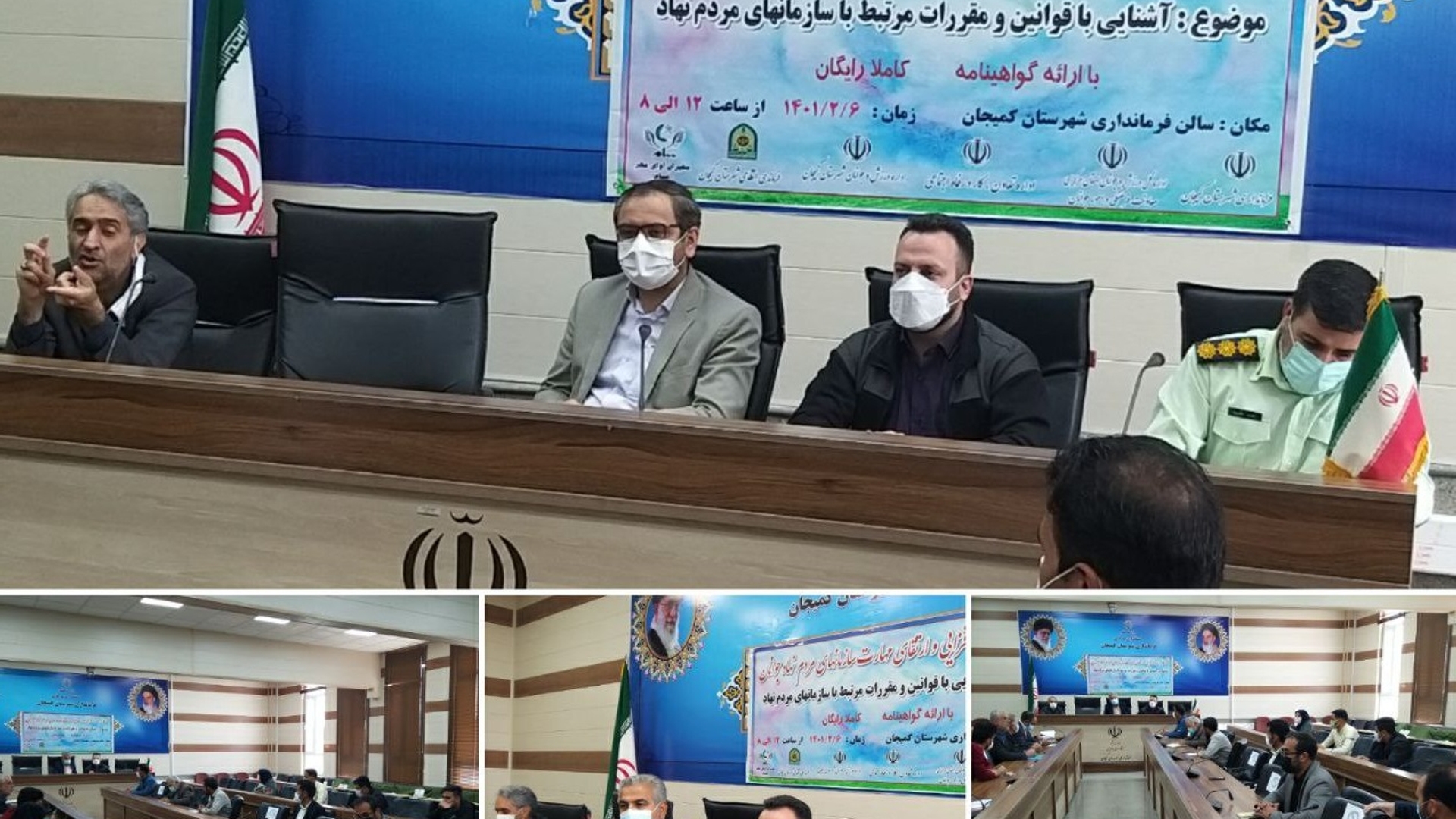 کارگاه آموزشی توانمندسازی سمن های شهرستان به ریاست ابراهیم رستمی، فرماندار شهرستان و با حضور حسن بداقی، معاون سیاسی اجتماعی فرمانداری، مجید قاسمی، بخشدار مرکزی کمیجان، سرهنگ ملکی پویا، فرمانده انتظامی شهرستان، ملوکی، نماینده اداره تعاون، کار و رفاه اجتماعی استان(به عنوان مدرس) اعضا و مدعوین مربوطه در محل سالن اجتماعات فخرالدین عراقی فرمانداری برگزار گردید.