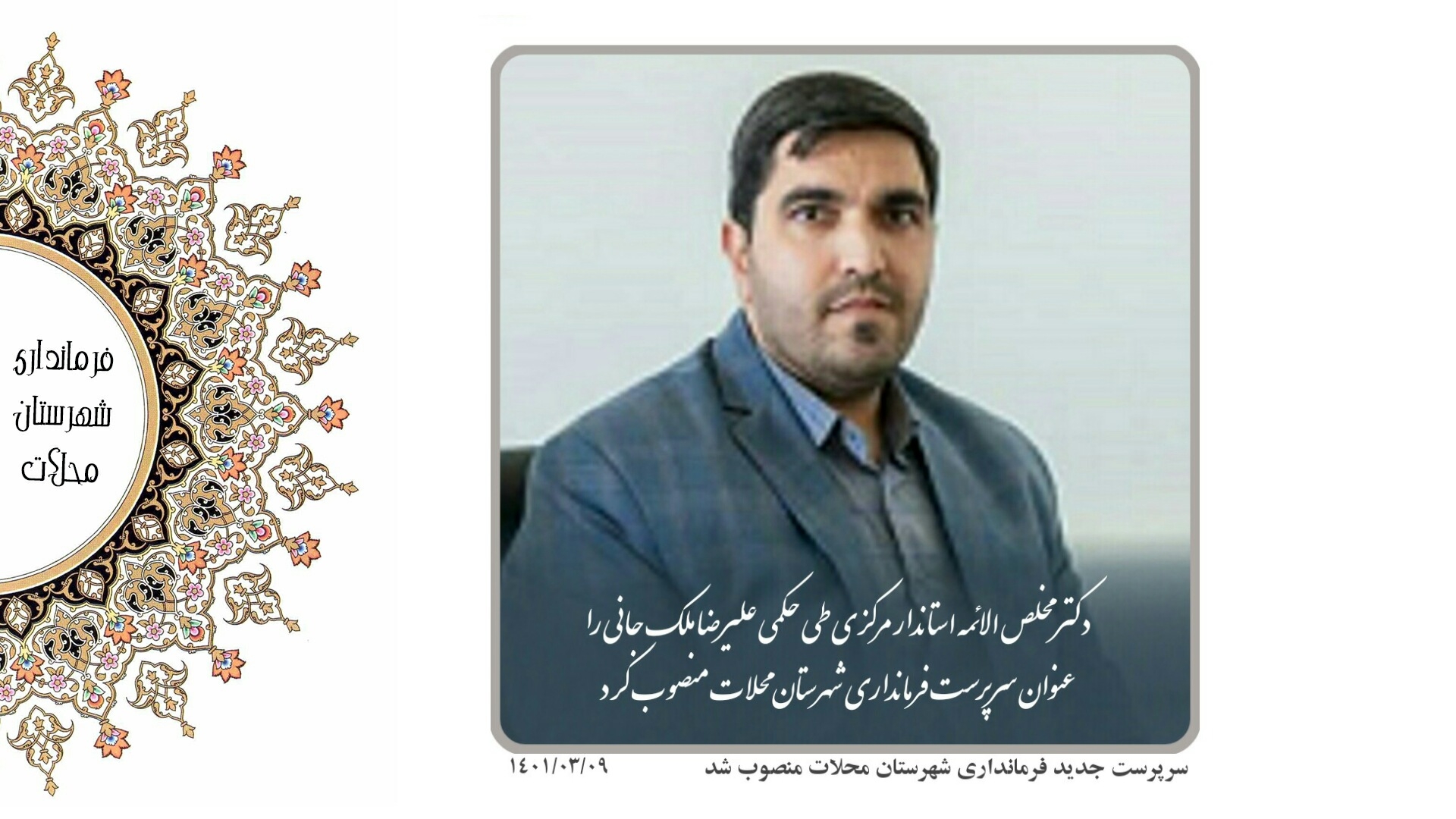 دکتر مخلص الائمه استاندار مرکزی طی حکمی علیرضا ملک جانی را به عنوان سرپرست فرمانداری شهرستان محلات منصوب نمود.
