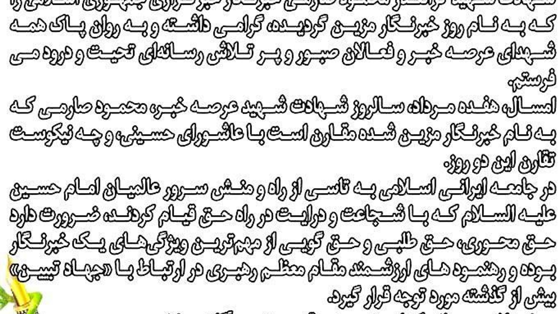 پیام تبریک روز خبرنگار جناب آقای آذری سرپرست فرمانداری شهرستان زرندیه به مناسبت فرارسیدن سالروز شهادت شهید گرانقدر محمود صارمی خبرنگار خبرگزاری جمهوری اسلامی که به نام روز خبرنگار مزین گردیده است. #فرمانداری_زرندیه https://t.me/fzarandieh