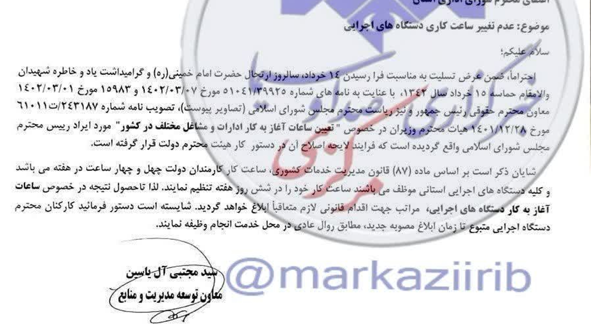 🔹با اعلام دکتر سید مجتبی آل یاسین معاون توسعه مدیریت و منابع استاندار مرکزی ساعت کاری دستگاههای اجرایی استان فعلا تغییر نمیکند. 🔸سید مجتبی آل یاسین با اشاره به مکاتبات دولت و مجلس در خصوص تغییر ساعت کاری دستگاههای اجرایی در فصل گرما ، در نامه ای خطاب به اعضای شورای اداری استان آورده است: از آنجا که تعیین ساعات آغاز به کار ادارات و مشاغل مختلف ، مورد ایراد رئیس مجلس شورای اسلامی ست و لایحه اصلاح آن در دستور کار دولت قرار گرفته است، کارکنان دستگاه های اجرایی تا زمان ابلاغ مصوبه جدید باید طبق روال عادی در محل کار حاضر شوند.