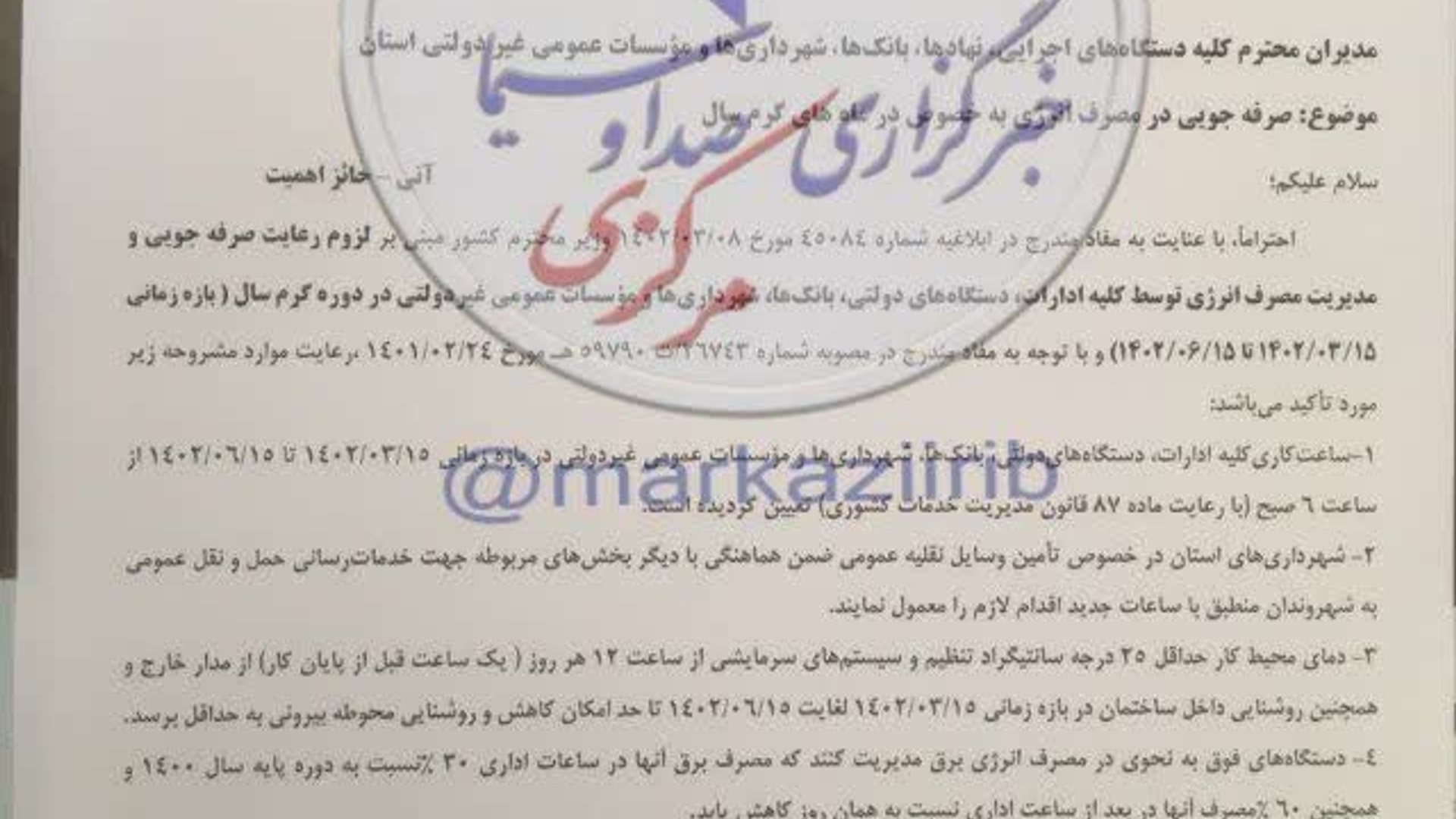 ابلاغیه معاون توسعه مدیریت و منابع استانداری مرکزی به دستگاه های اجرایی در خصوص ساعت کاری روزانه ادارات و لزوم صرفه جویی در مصرف انرژی در فصل گرم سال