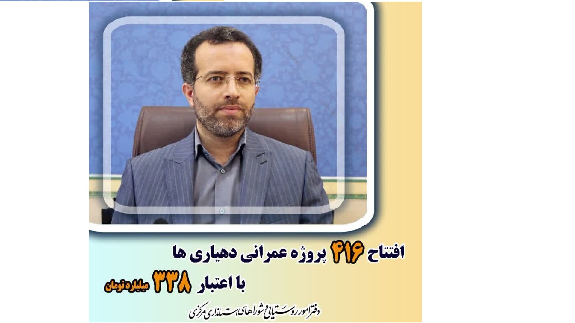 🔸تعداد ۴۱۶ پروژه اجرا شده توسط دهیاری ها با اعتباری بالغ بر ۳۳۸ میلیارد تومان در هفته دولت سال جاری افتتاح خواهند شد.