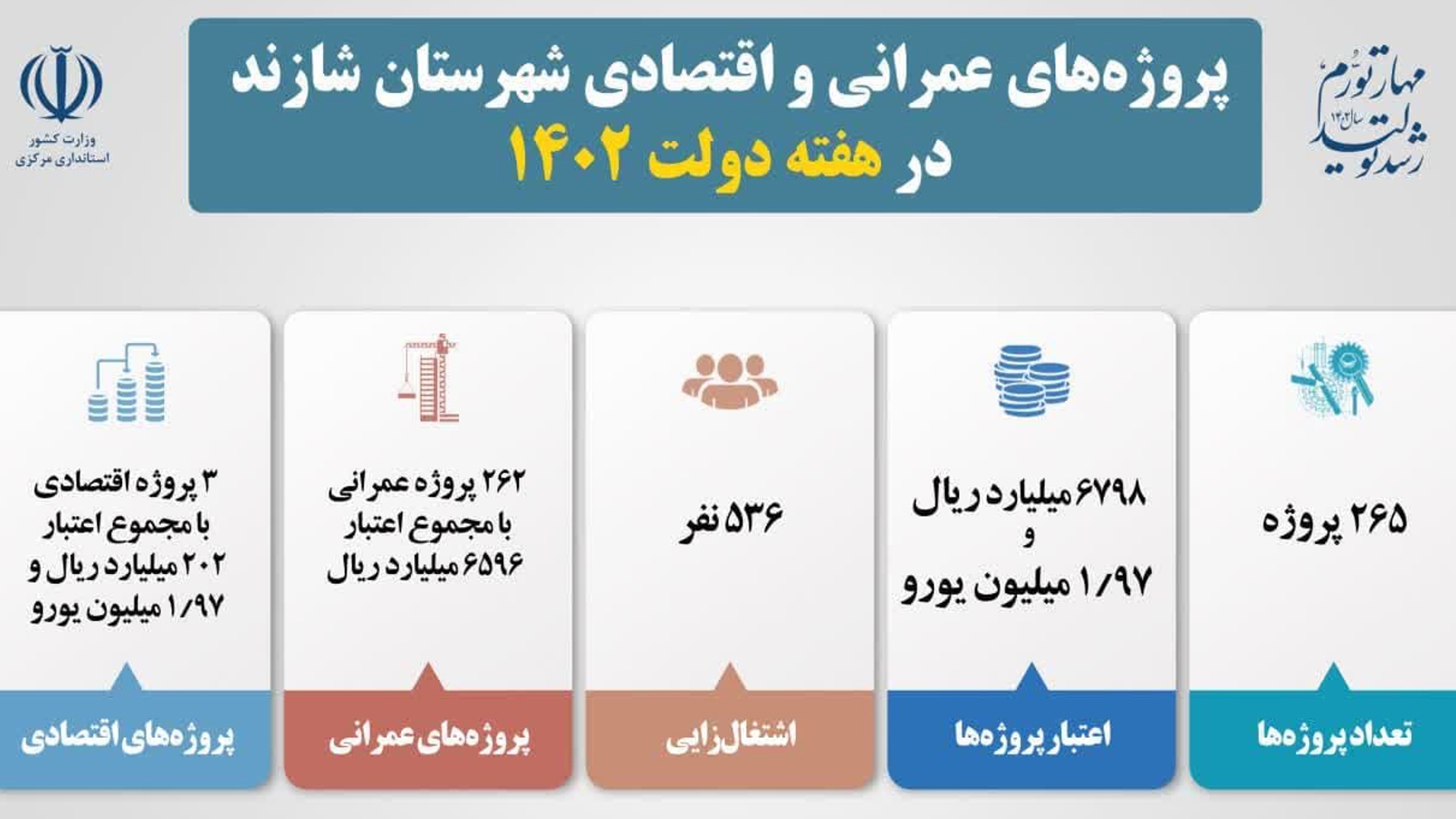 از تعداد کل طرحهای هفته دولت در شهرستان شازند، ۲۶۲ پروژه با مجموع اعتبار ۶ هزار و ۵۹۶ میلیارد ریال در حوزه عمرانی و ۳ پروژه با اعتبار ۲۰۲ میلیارد ریال اعتبار و ۱.۹۷ میلیون یورو آورده ارزی، اقتصادی است.