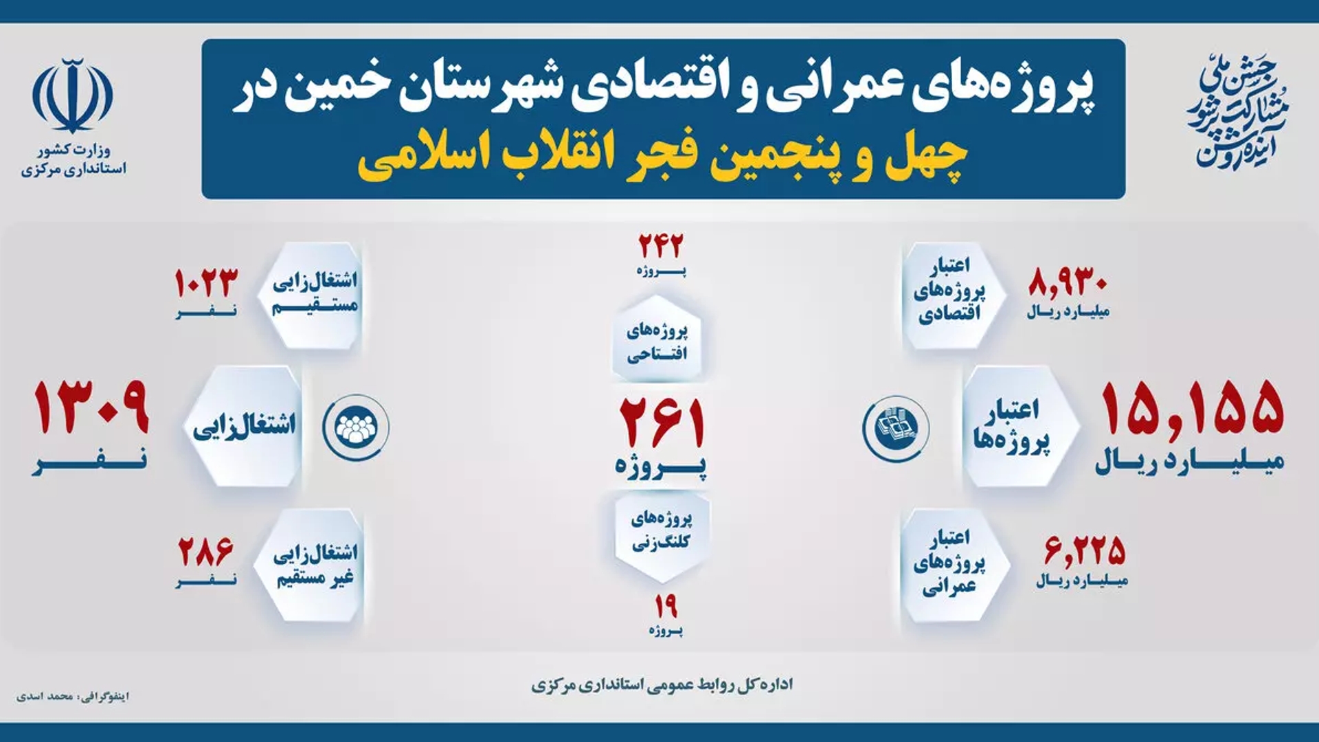 از تعداد کل طرحهای دهه فجر در شهرستان خمین، ۲۵۳ طرح با مجموع اعتبار ۶ هزار و ۲۵۵ میلیارد ریال در حوزه عمرانی و ۸ طرح با اعتبار ۸ هزار و ۹۳۰ میلیارد ریال اعتبار، اقتصادی است.