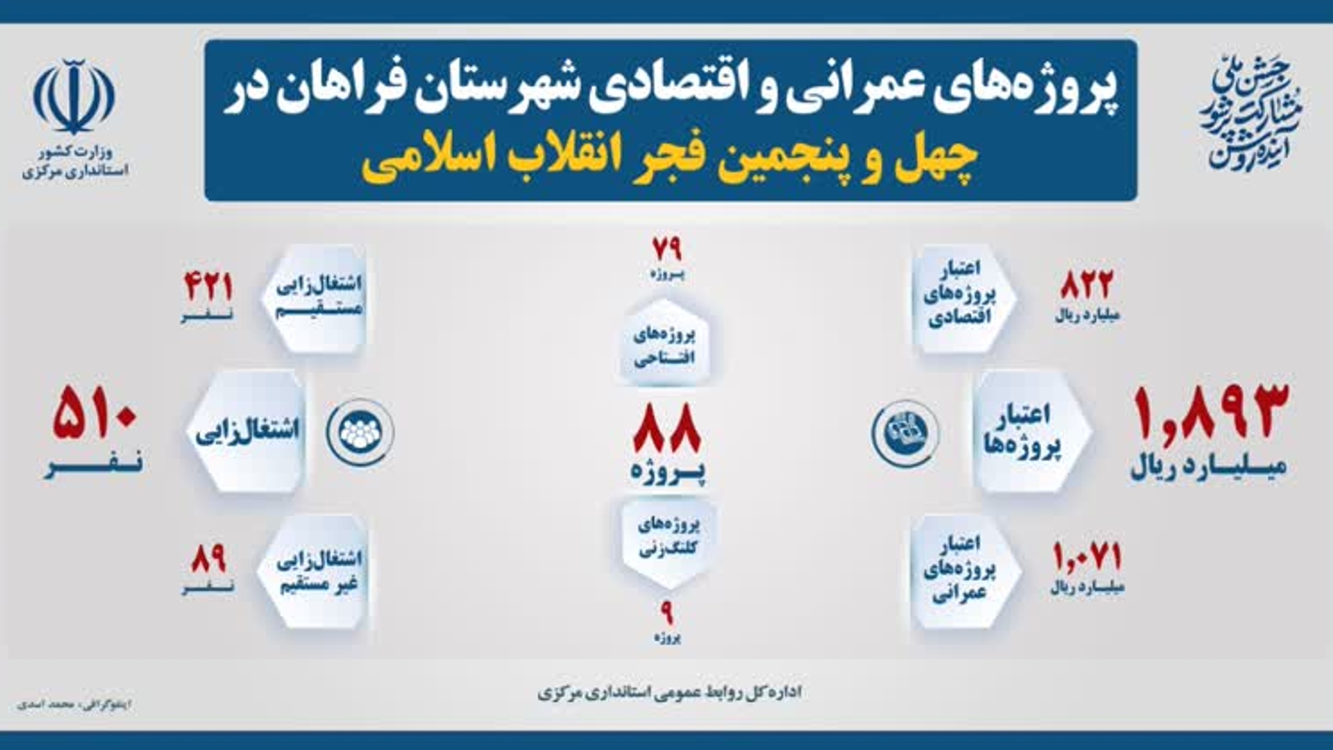 به مناسبت چهل و پنجمین سالگرد پیروزی شکوهمند انقلاب اسلامی از ۷۹ طرح عمرانی و اقتصادی در شهرستان فراهان بهرهبرداری و عملیات اجرایی ۹ طرح نیز آغاز میشود. این طرحها با یک هزار و ۸۹۳ میلیارد ریال اعتبار و سرمایهگذاری، برای ۵۱۰ نفر در این شهرستان، ایجاد اشتغال میکند. از تعداد کل طرحهای دهه فجر در شهرستان فراهان، ۸۶ طرح با مجموع اعتبار یک هزار و ۷۱ میلیارد ریال در حوزه عمرانی و دو طرح با ۸۲۲ میلیارد ریال اعتبار و سرمایهگذاری، اقتصادی است. تعدادی از طرحهای مهم عمرانی و اقتصادی در شهرستان فراهان روز دوشنبه در پنجمین روز از دهه مبارک فجر، با حضور استاندار مرکزی مورد بهرهبرداری قرار میگیرد. در هفته دولت سال جاری نیز ۶۰ طرح عمرانی و اقتصادی در شهرستان فراهان مورد بهرهبرداری قرار گرفت. 🔹 همزمان با ایام دهه مبارک فجر، یک هزار و ۷۱۳ طرح عمرانی و اقتصادی مهم در سطح استان مرکزی افتتاح و کلنگزنی میشود که از این تعداد، یک هزار و ۵۲۳ طرح افتتاح و عملیات اجرایی ۱۹۰ طرح نیز آغاز خواهد شد.