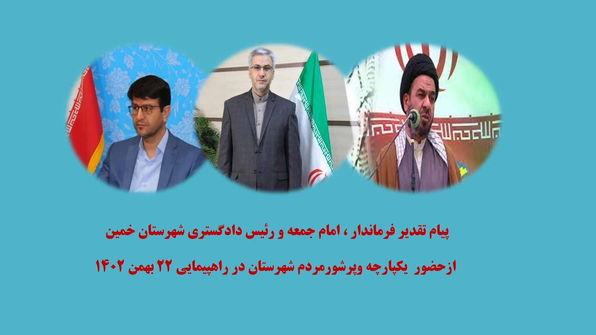 پيام تقدير فرماندار ، امام جمعه و رئیس دادگستری شهرستان خمين ازحضور يكپارچه وپرشورمردم شهرستان در راهپيمايي 22 بهمن