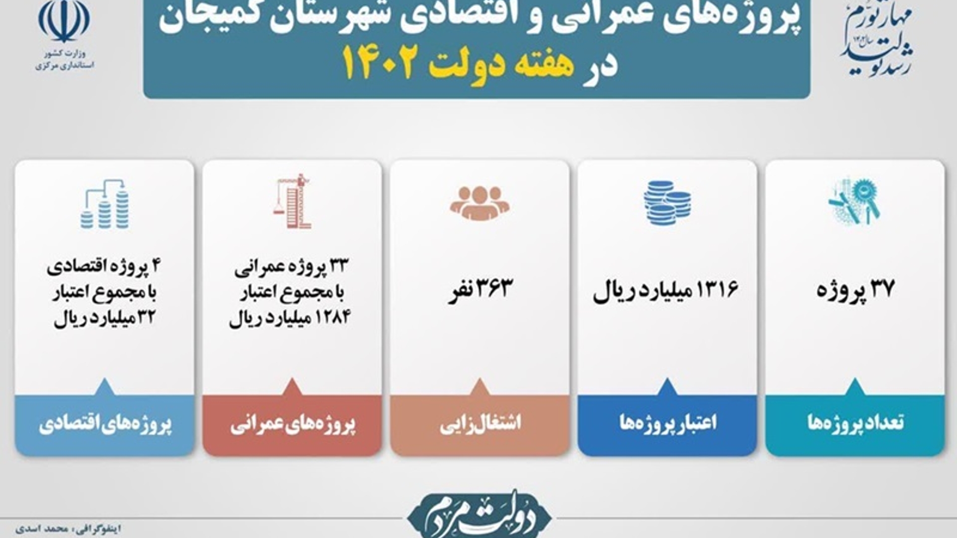 از تعداد کل طرحهای هفته دولت در شهرستان کمیجان، ۳۳ پروژه با مجموع اعتبار یک هزار و ۲۸۴ میلیارد ریال در حوزه عمرانی و ۴ پروژه با اعتبار ۳۲ میلیارد ریال، اقتصادی است.