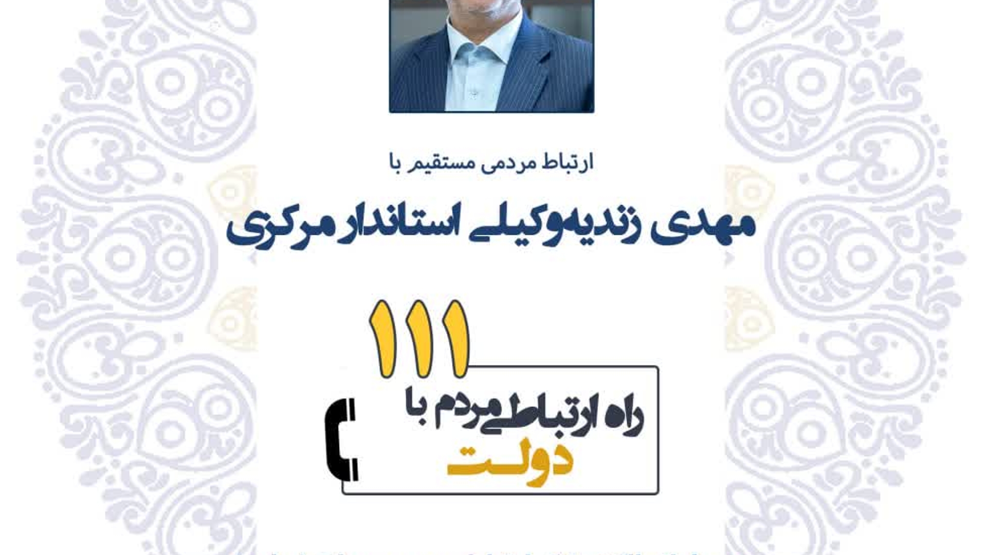 ☎️ پاسخگویی استاندار مرکزی به تماسهای مردمی/ گفتوگوی بیواسطه با دکتر مهدی زندیهوکیلی 🗓 یکشنبه ۲۹ تیر، ساعت ۱۱ تا ۱۲ 📞تلفن ۱۱۱ #استان_مرکزی #سامد