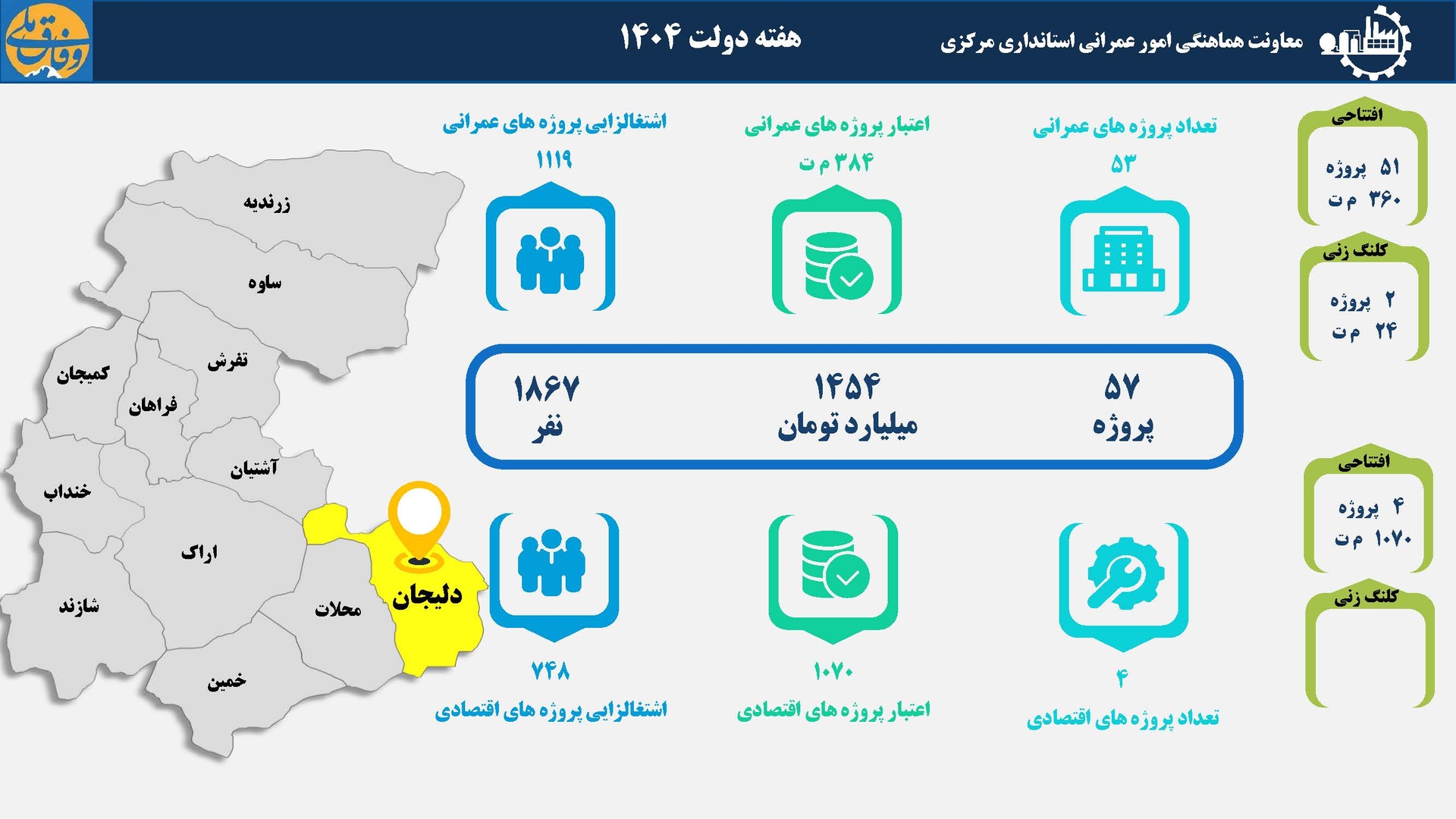 به مناسبت هفته دولت از 55 طرح عمرانی و اقتصادی در شهرستان دلیجان بهرهبرداری و عملیات اجرایی 2 طرح نیز آغاز میشود.